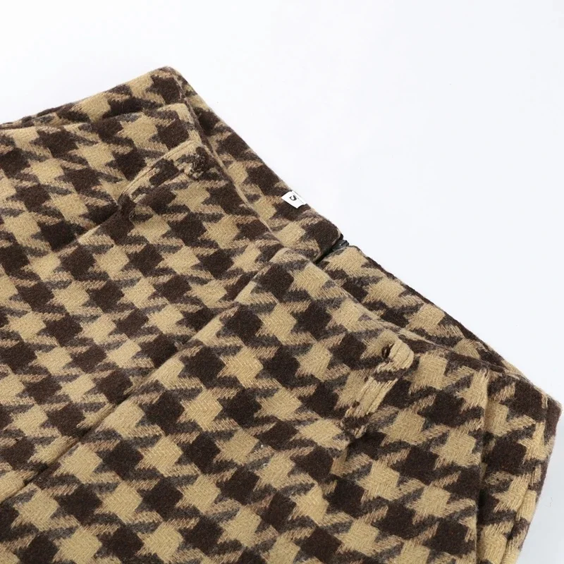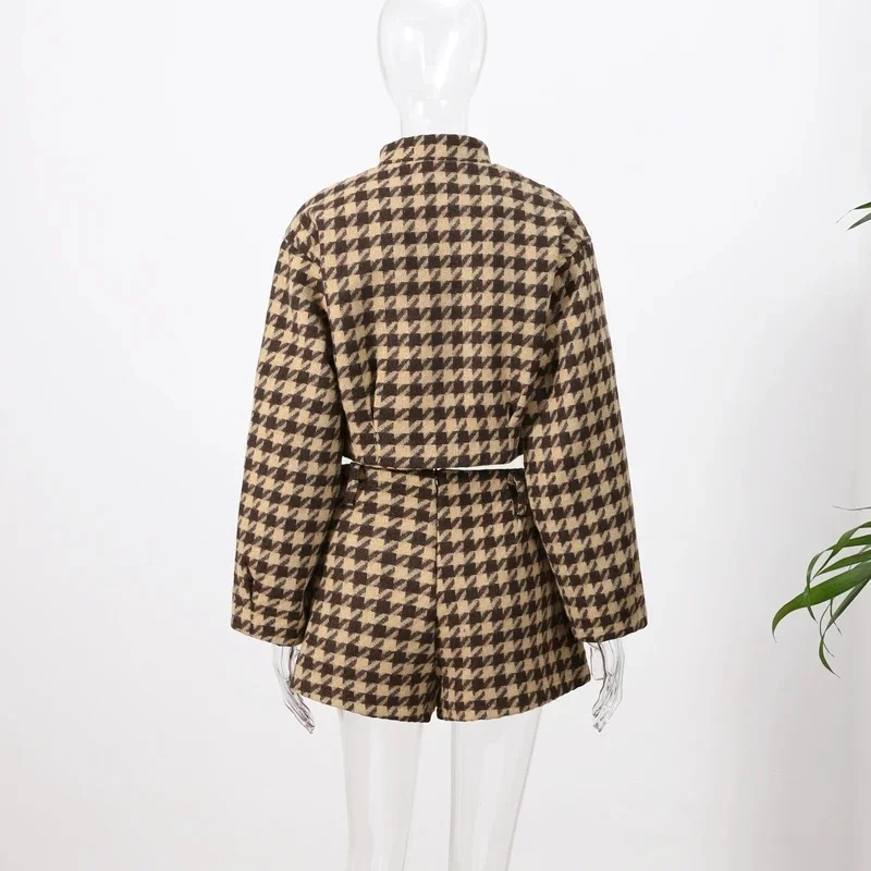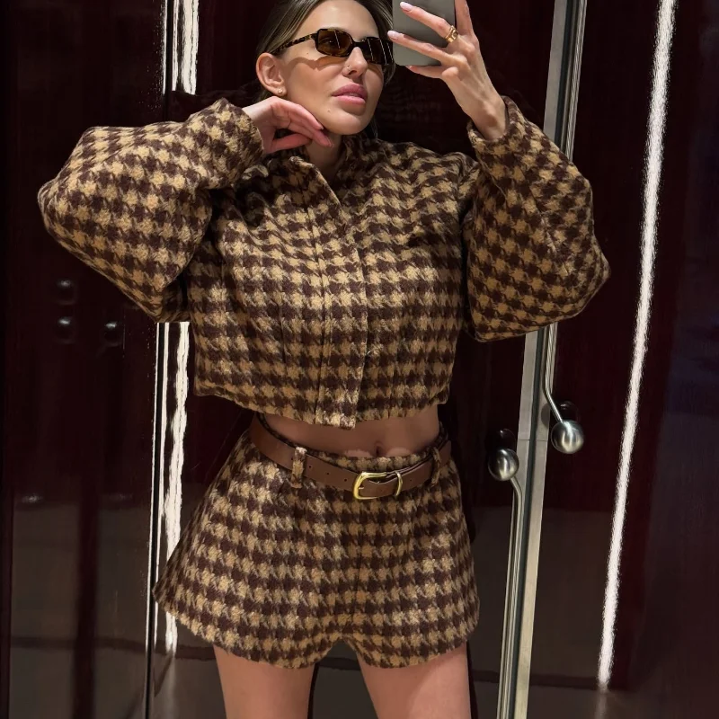 Vintage Brown Women Plaid Coat Short Sets 2 Piece Long Sleeve Lapel Jacket High Waist Slim Fit Short 2025 Lady Fashion Outifits