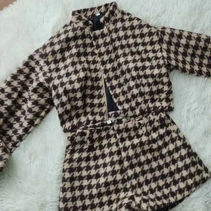 Featuring a chic plaid pattern and a stand collar, this set exudes elegance and sophistication.