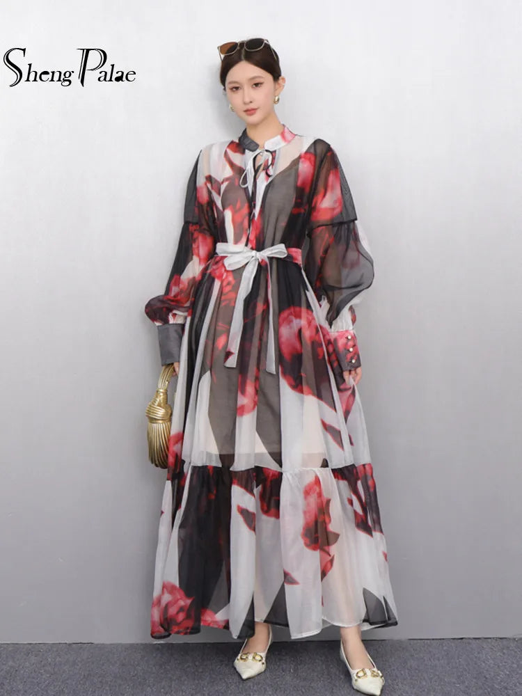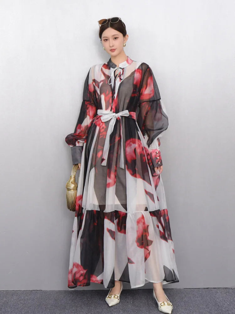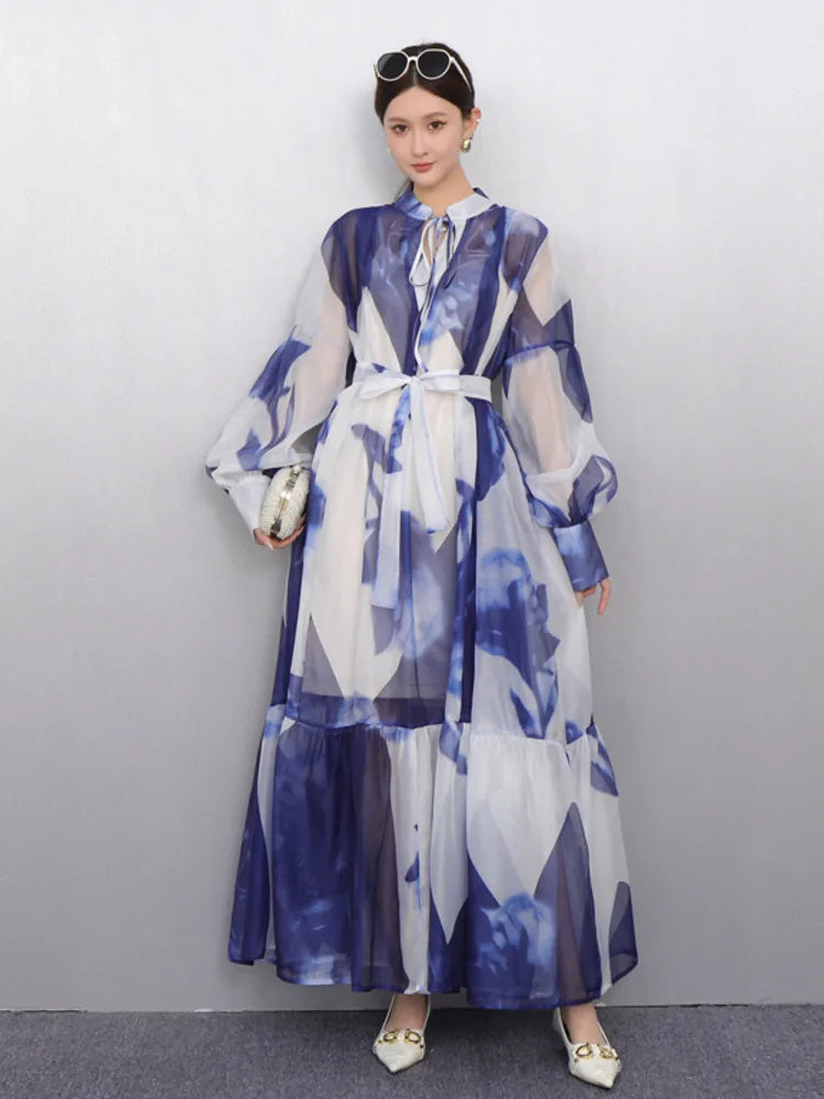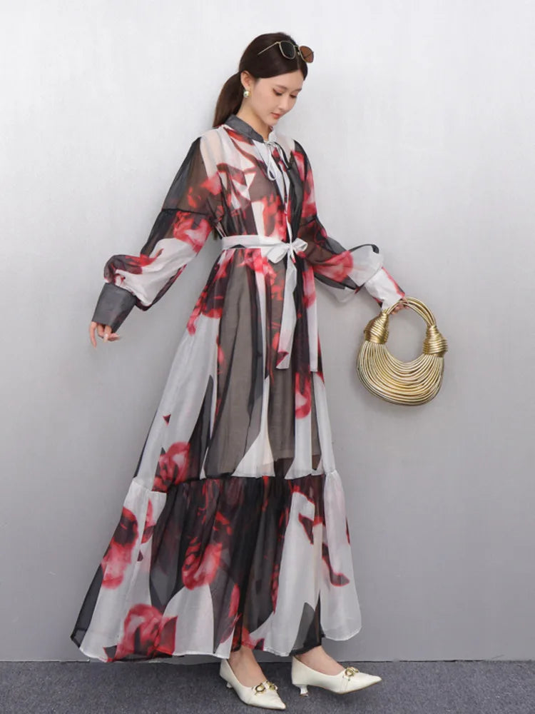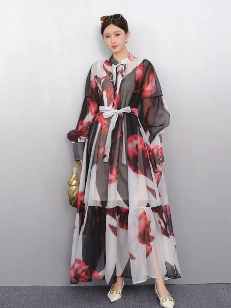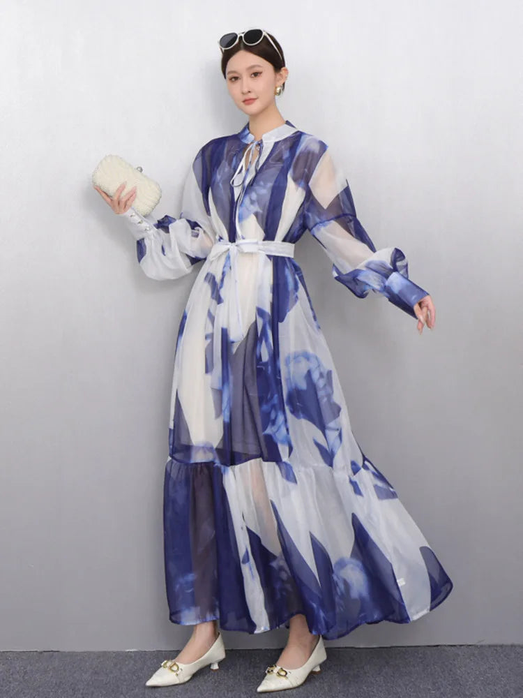 2025 Summer New O Neck Long Sleeve Loose Mid Long Styles Girdling Waist Dress Women