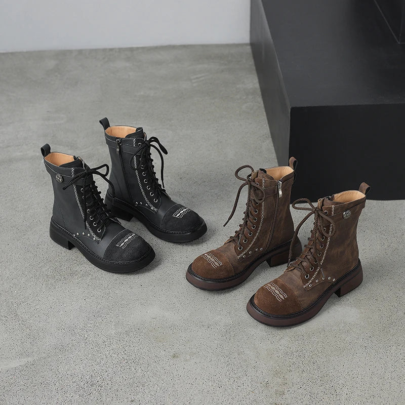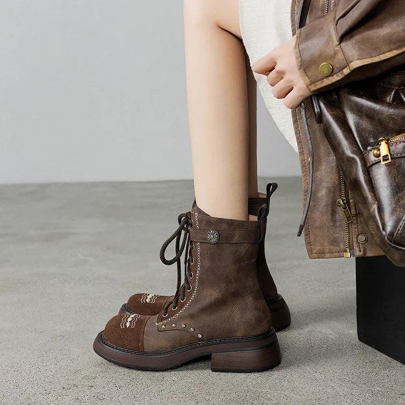 Step into style with 2026’s new autumn-winter women's ankle boots crafted from natural split cow leather & suede. Featuring elegant embroidery, a comfortable thick heel, and durable design. Perfect short boots for women (size 22–25cm). Shop now for trendy, warm, and fashionable footwear!