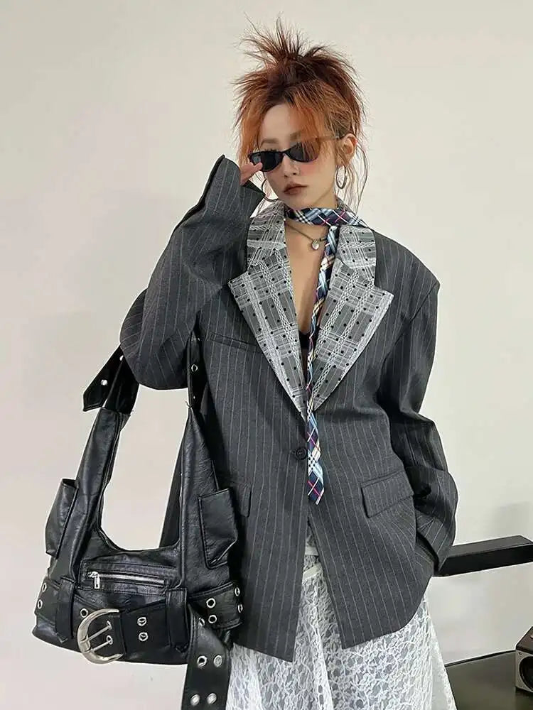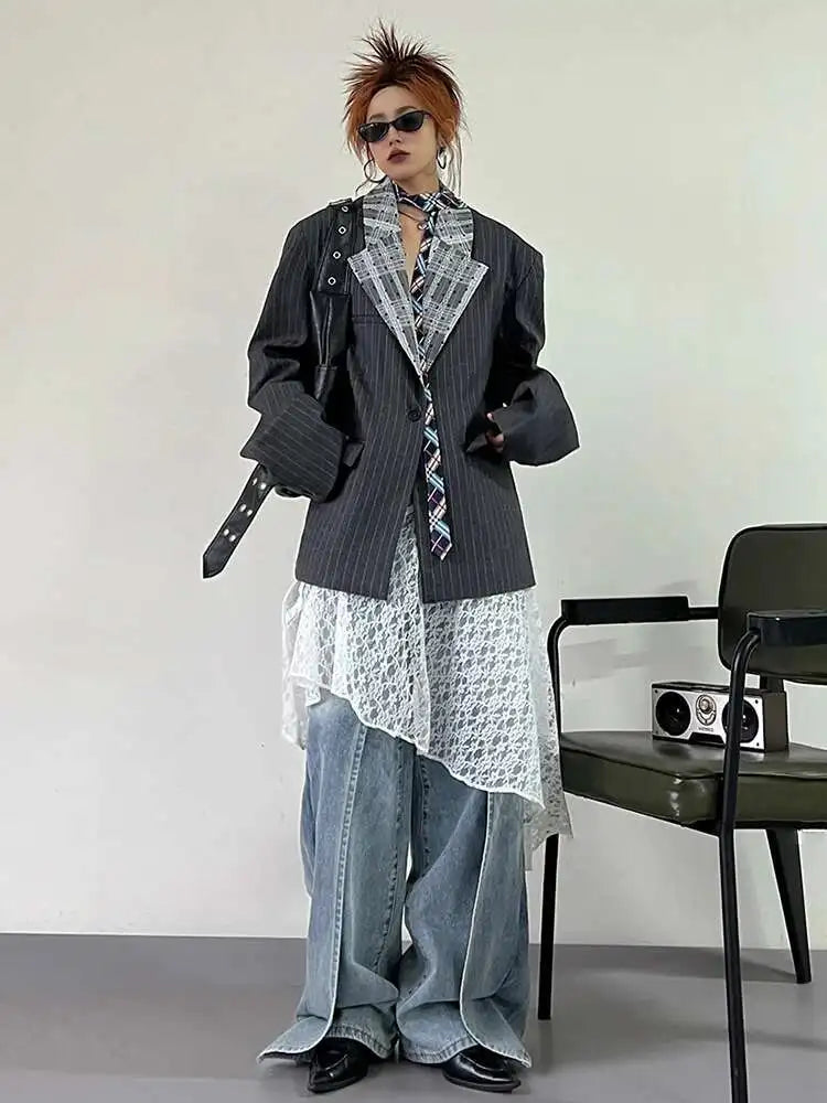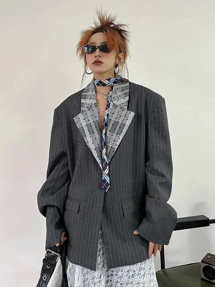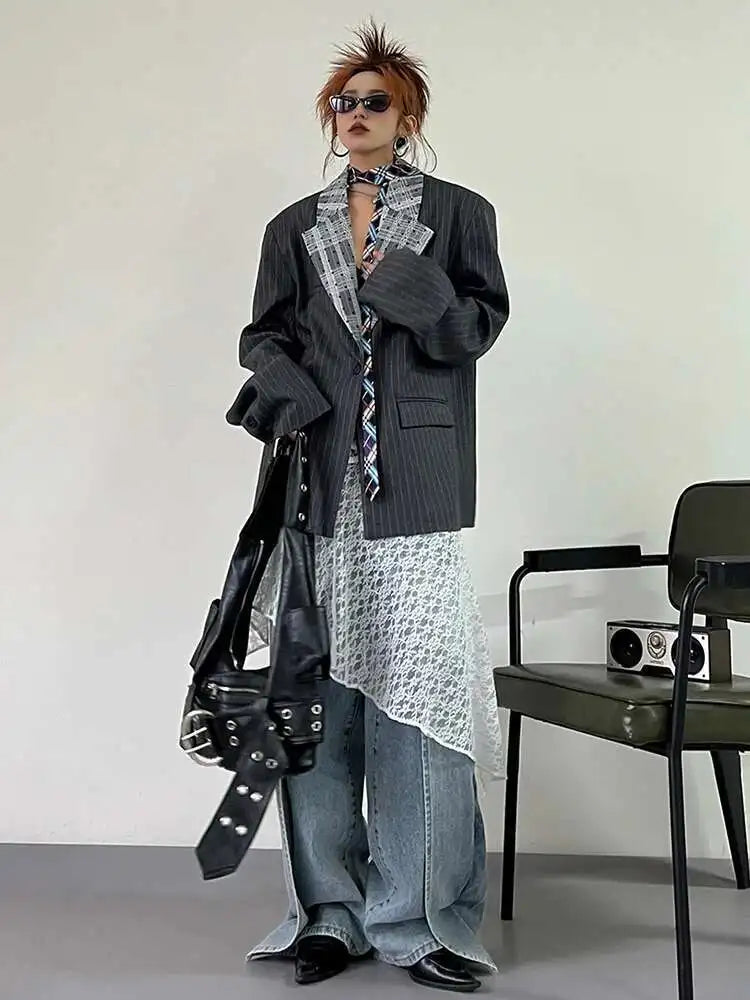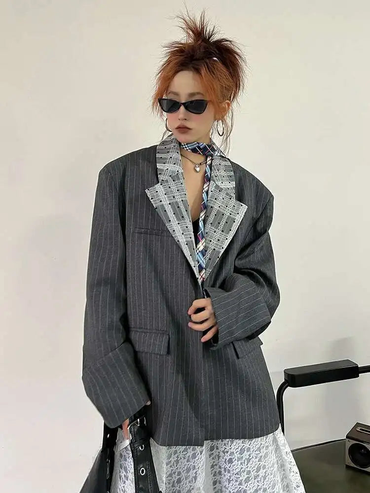 Keyword Focus: big size blazer, women’s gray stripe jacket, lace spliced fashion