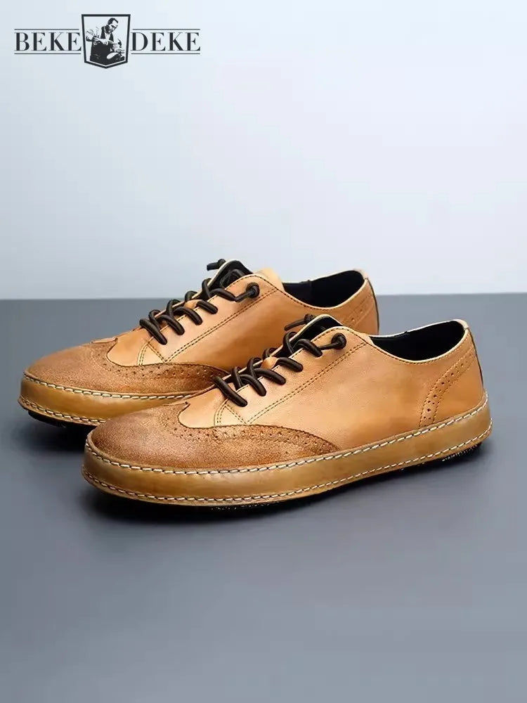 Handmade Vintage Wing Tip Brogues Men Platform Slip On Loafers Cowhide Genuine Leather Skateboard Shoes Casual Trainers Joggers Sneakers
