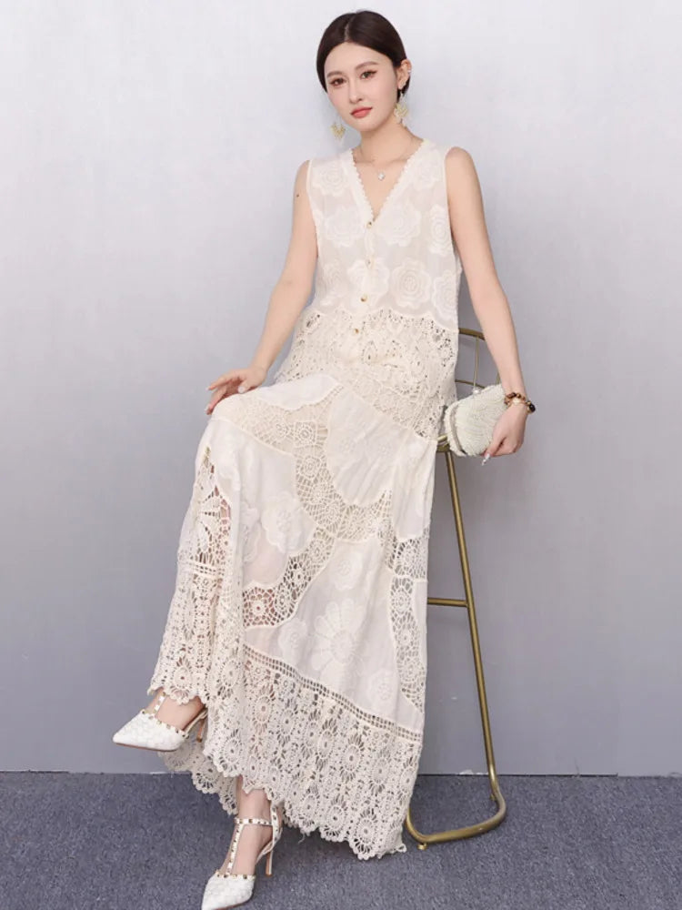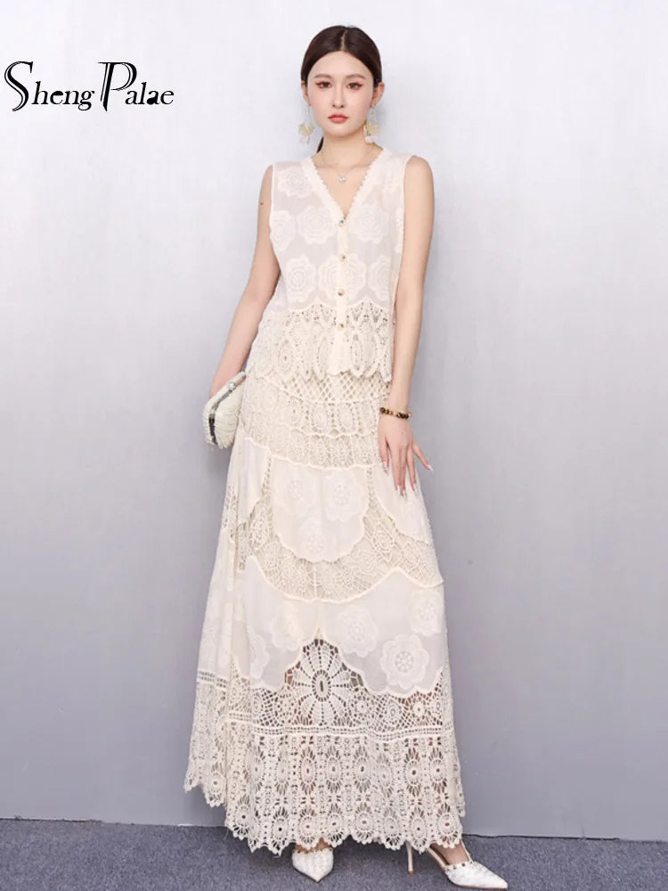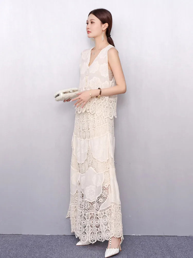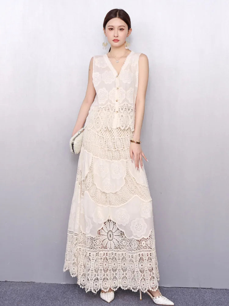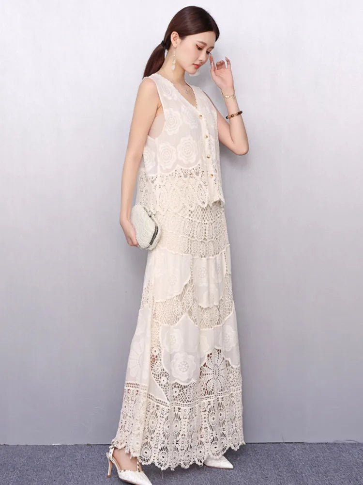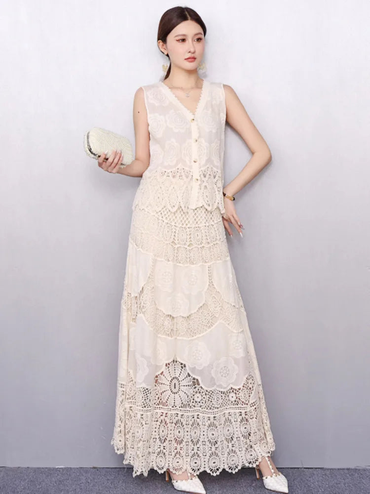 Turn heads with this elegant 2-piece 2025 summer outfit. Features a V-neck sleeveless lace embroidery shirt and high-waist skirt—perfect for breezy, flattering style all season long.
