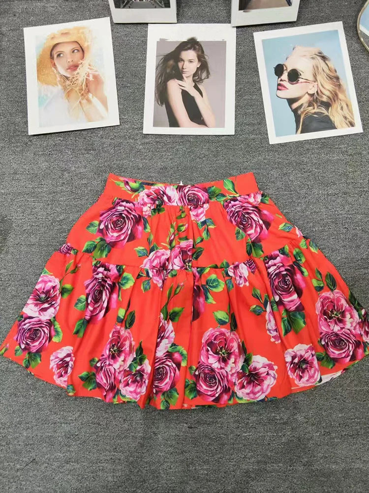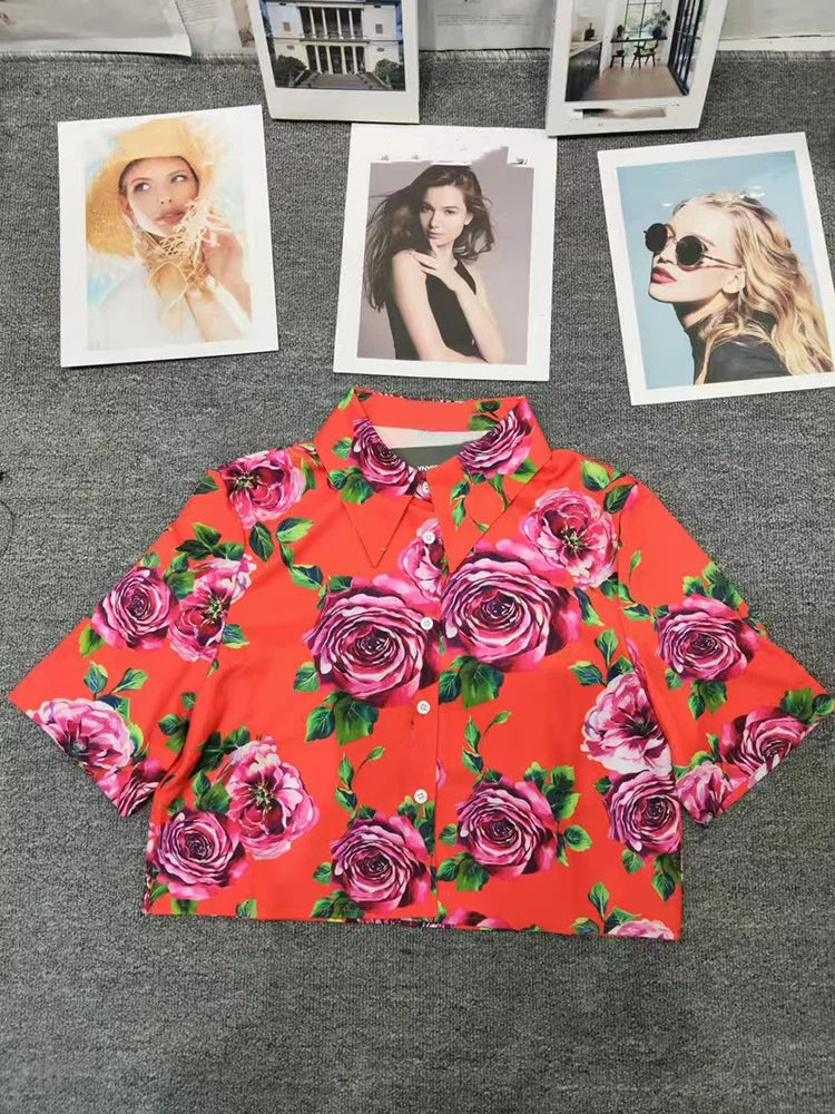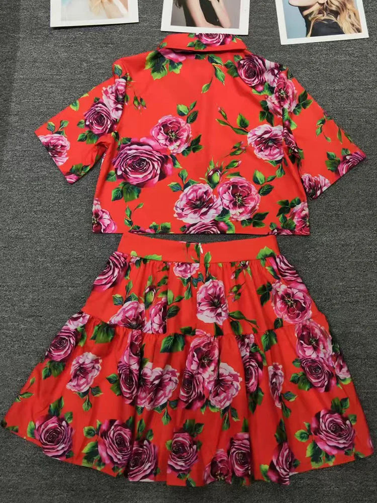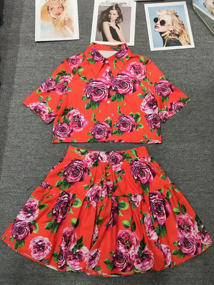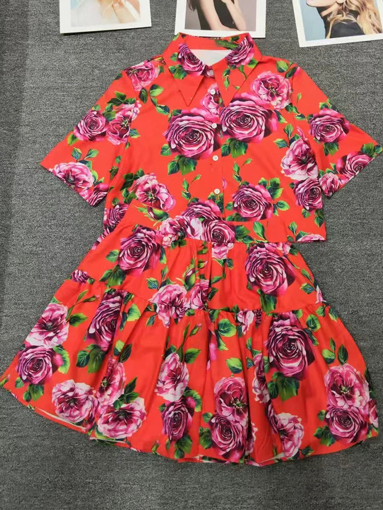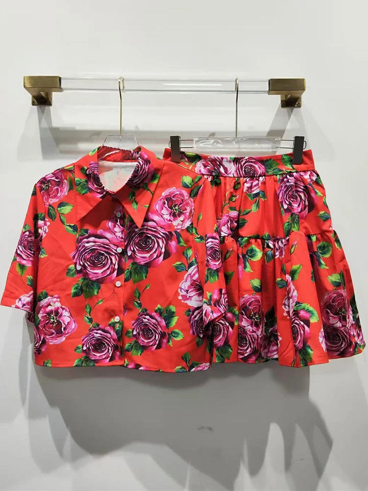 Retro flower prints single-breasted short-sleeved Joker short-sleeved blouse new two-piece high waist skirt, fashion women