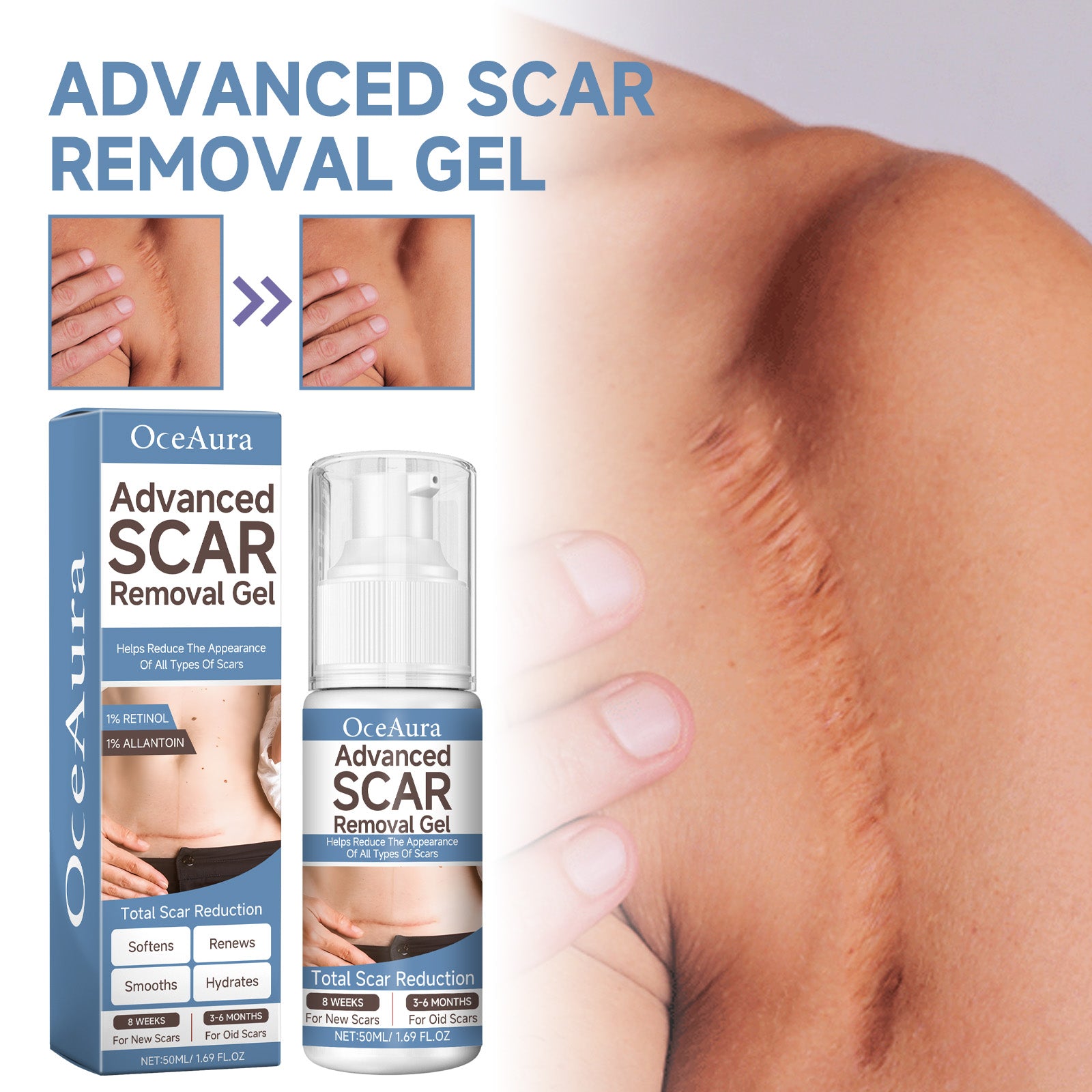 Our Advanced Scar Removal Gel contains Retinol, Allantoin, and Tocopherol. It can promote the growth of new tissue by reducing pigment and fading scars, aid healing, effectively improve the appearance of the skin, and provide moisture to the skin to help the skin form a protective barrier and repair skin scars. Its use method is very simple: clean and dry the affected area before use, apply an appropriate amount of gel to the affected area, and gently massage until completely absorbed. It can reduce scars, improve skin, and solve different skin problems.