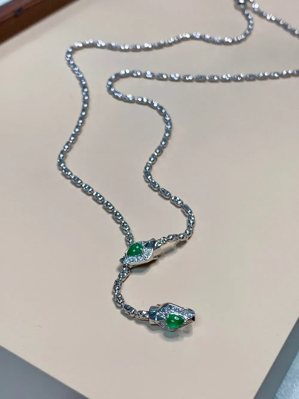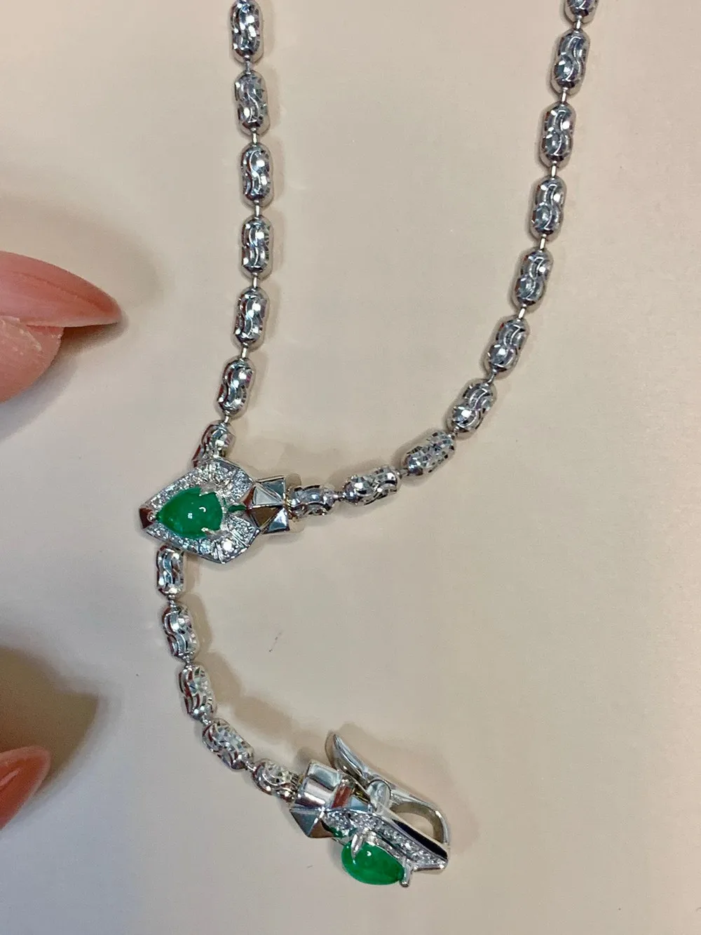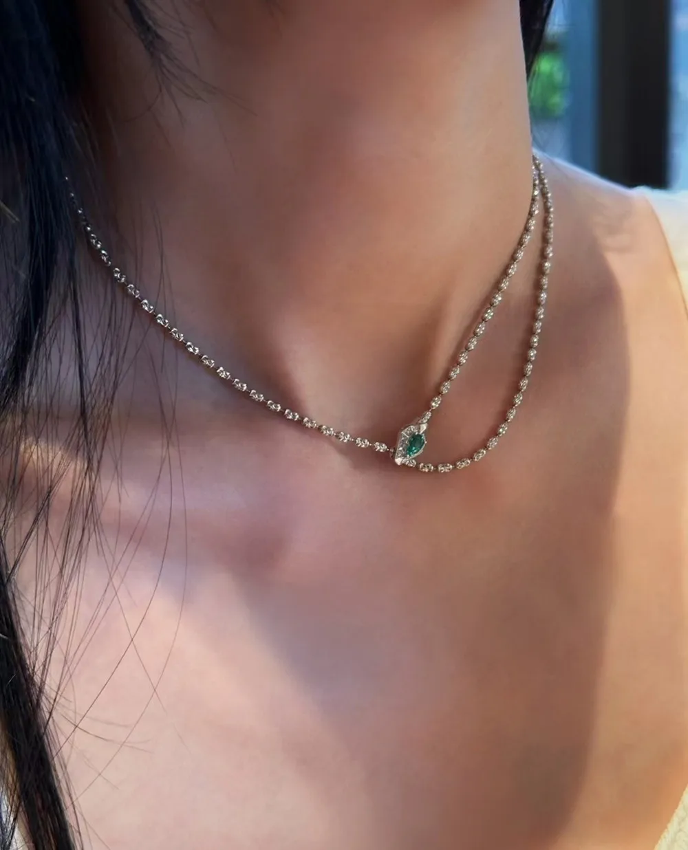 Shelly Real 18K White Gold Snake Necklace w/ Diamonds & Emeralds | AU750