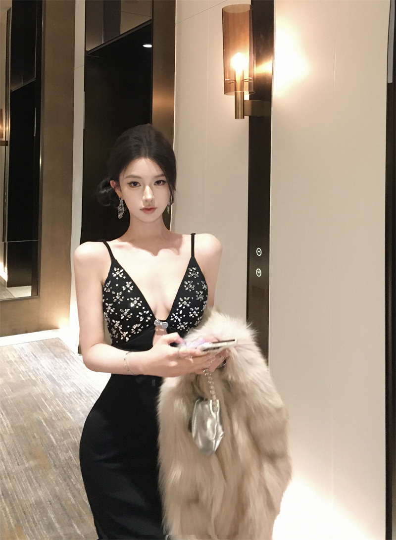 Spicy Women's Dress with Rhinestone Metal Accessories Long Length Fitted Halter Dress