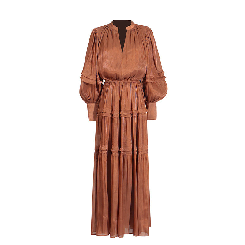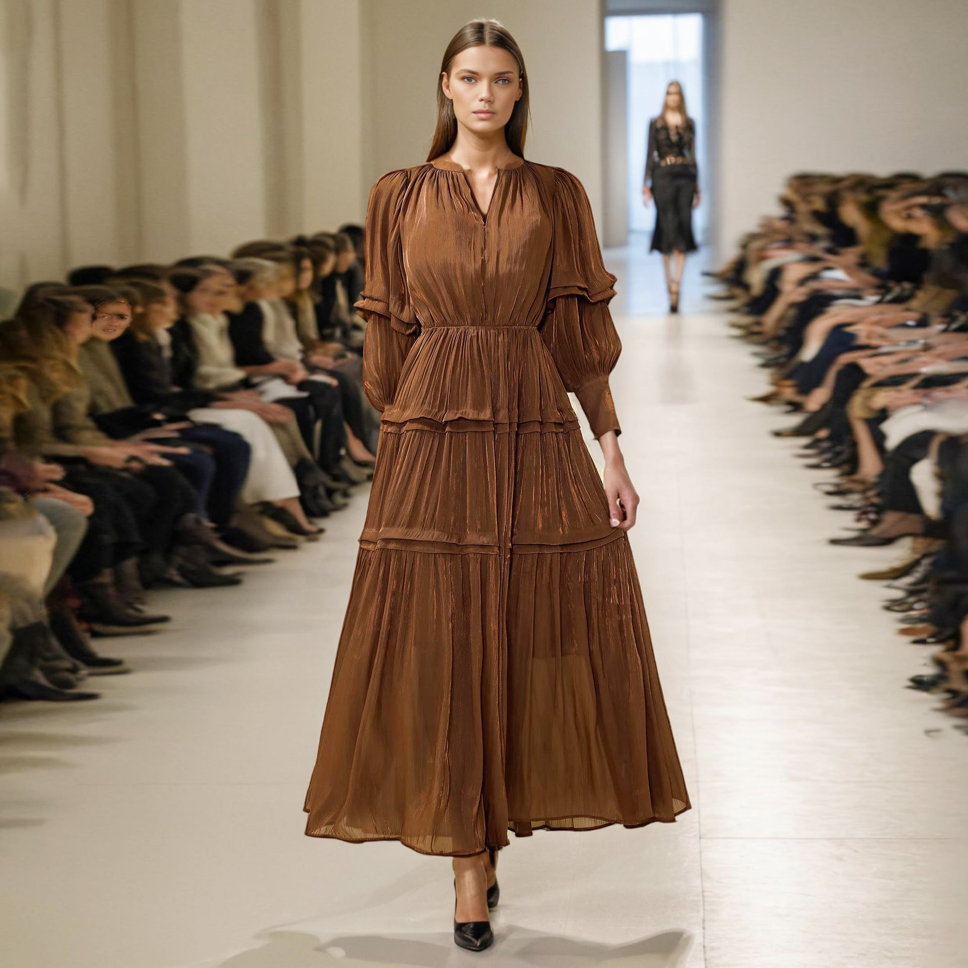 Step back in time with this beautifully crafted vintage dress that combines classic silhouettes with timeless elegance. The flowing lantern sleeves create a dramatic, romantic silhouette, while the delicate pleated ruffles add feminine charm to every movement.