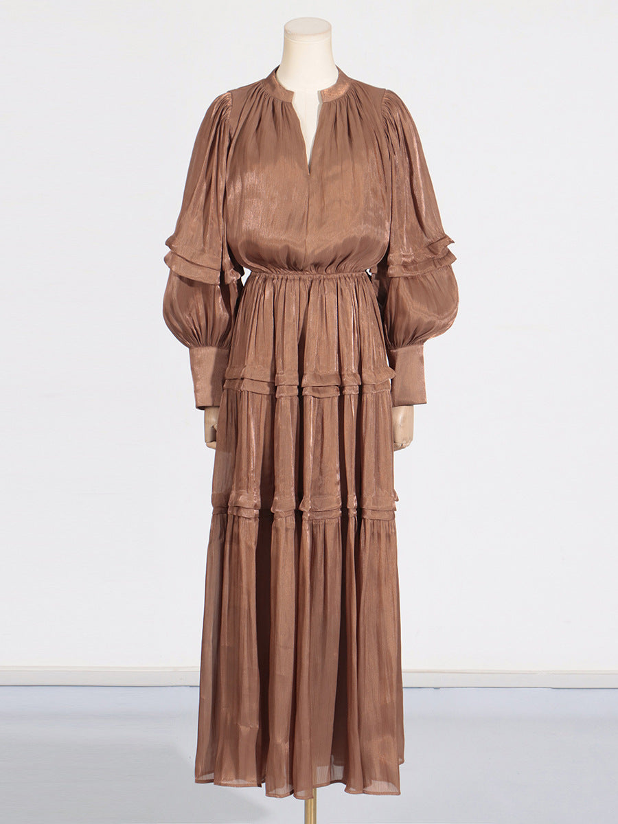 Vintage Dress with Lantern Sleeves Pleated Ruffle Edges Waist Cinching Long Skirt