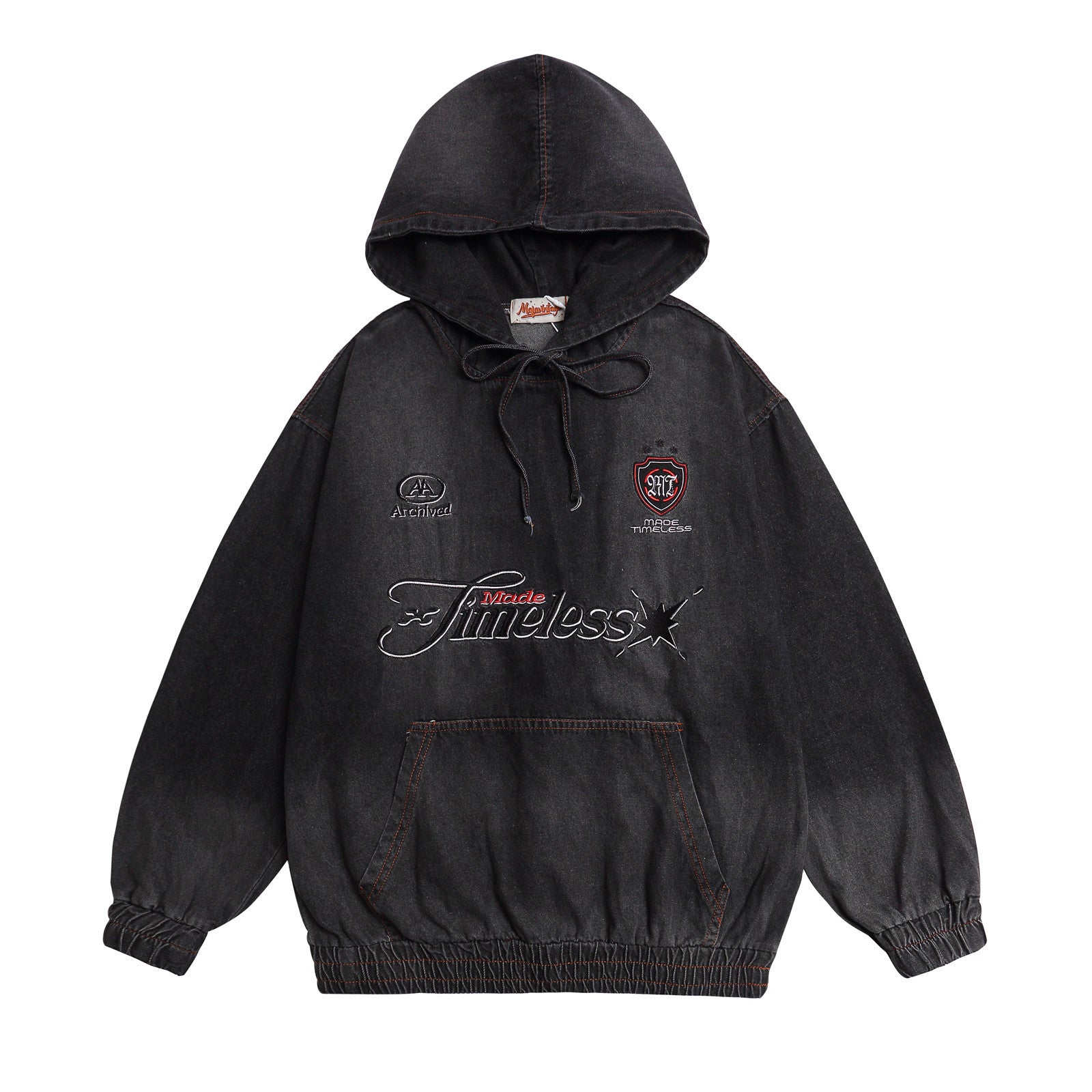 Washed Letter Embroidered Denim Hoodie Unisex Loose Casual Couple Top