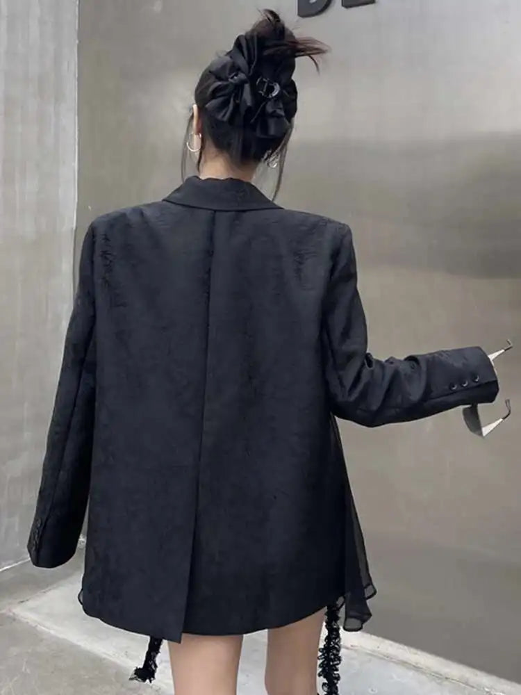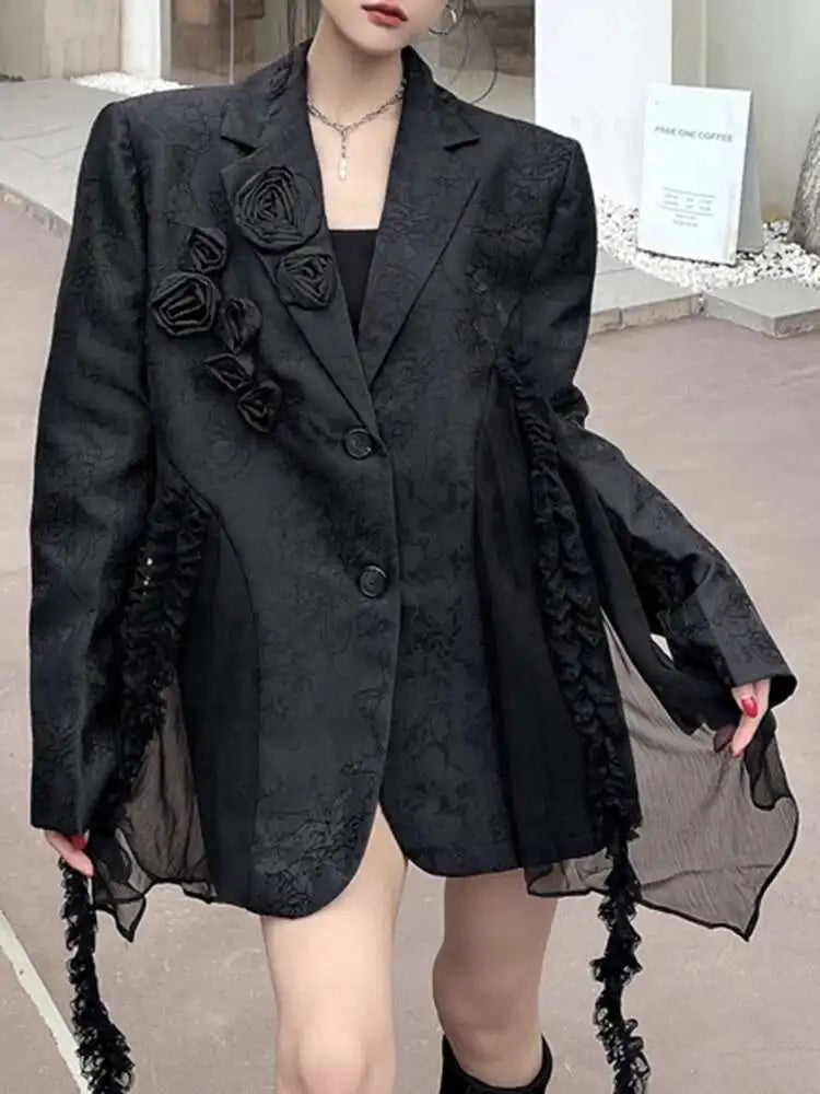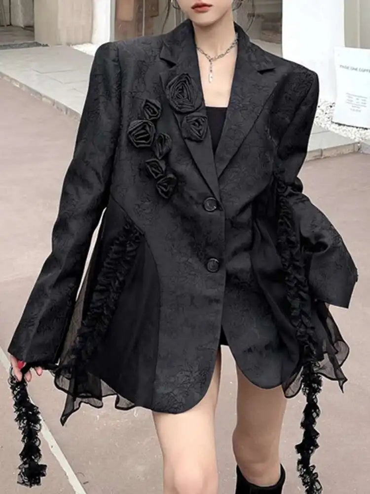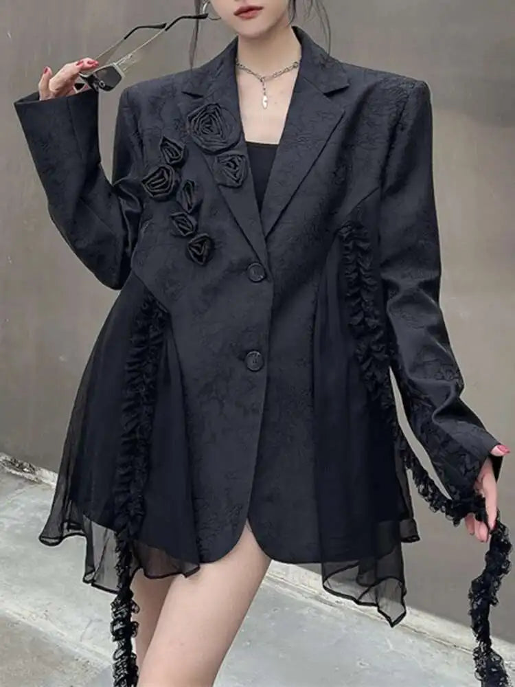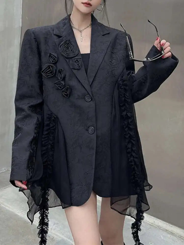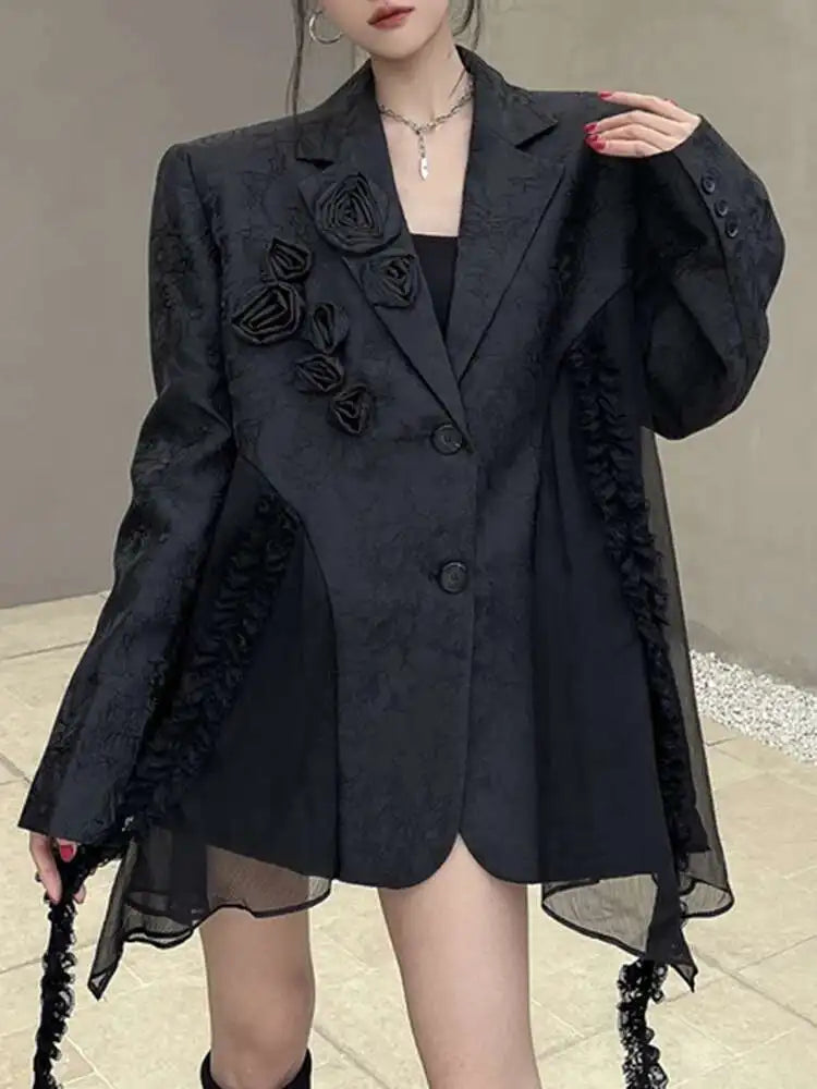 Women’s Black Plus Size Chiffon Spliced 3D Flower Lapel Blazer
