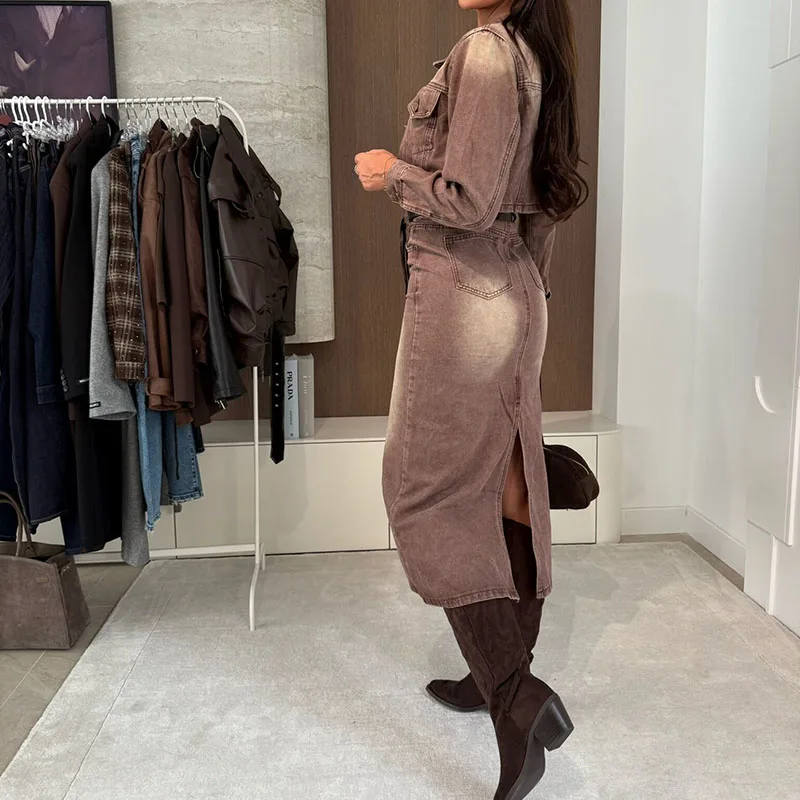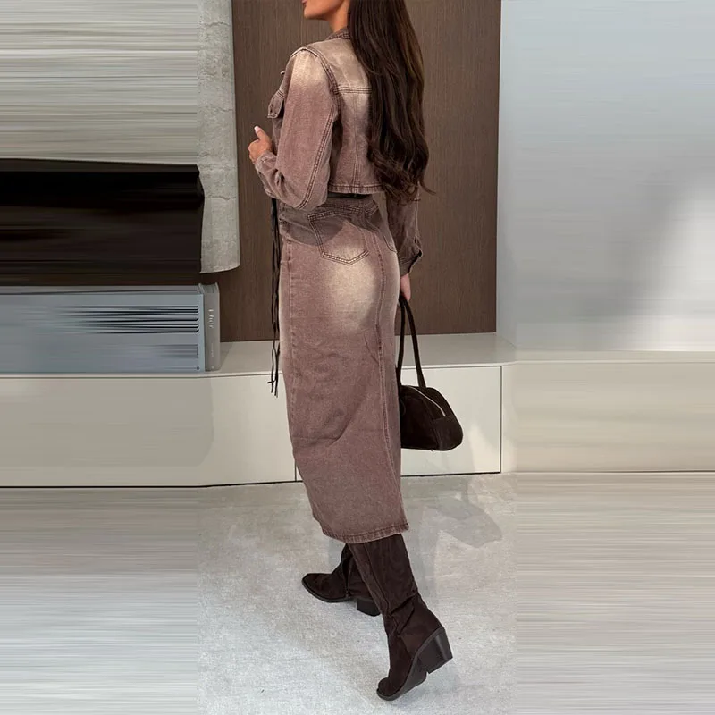 Women's Casual Long Sleeve Denim 2-Piece Suit Set – Solid Color High Street Elegant Slim Fit Lapel Collar Button-Up Coat + Midi Half Skirt Set for 2025