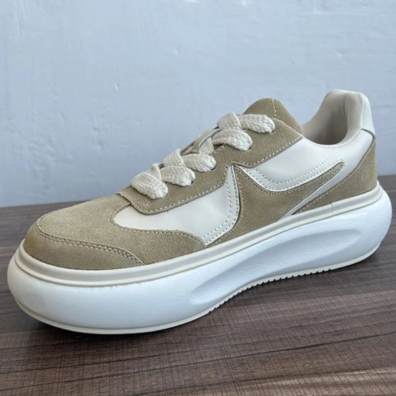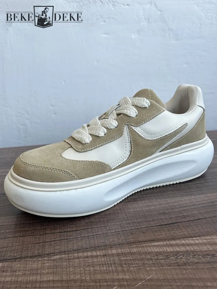 Youth Trend Solid Color Round Toe Platform Unisex Sneakers Handmade Genuine Leather Height Increase Mid Heel Lace-Up Casual Shoes